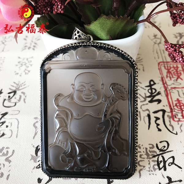 冰种黑曜石如意笑佛吊坠(镶银)