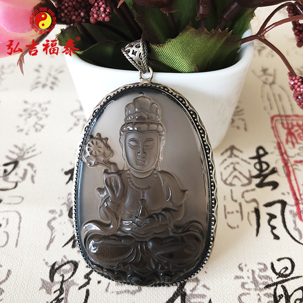 冰种黑曜石法轮观音吊坠(镶银)