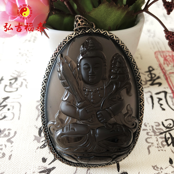 冰种黑曜石虚空藏菩萨吊坠(镶银)