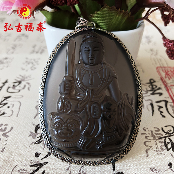 冰种黑曜石文殊菩萨吊坠(镶银)