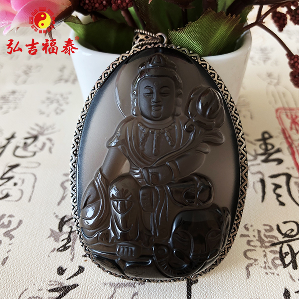 冰种黑曜石普贤菩萨吊坠(镶银)